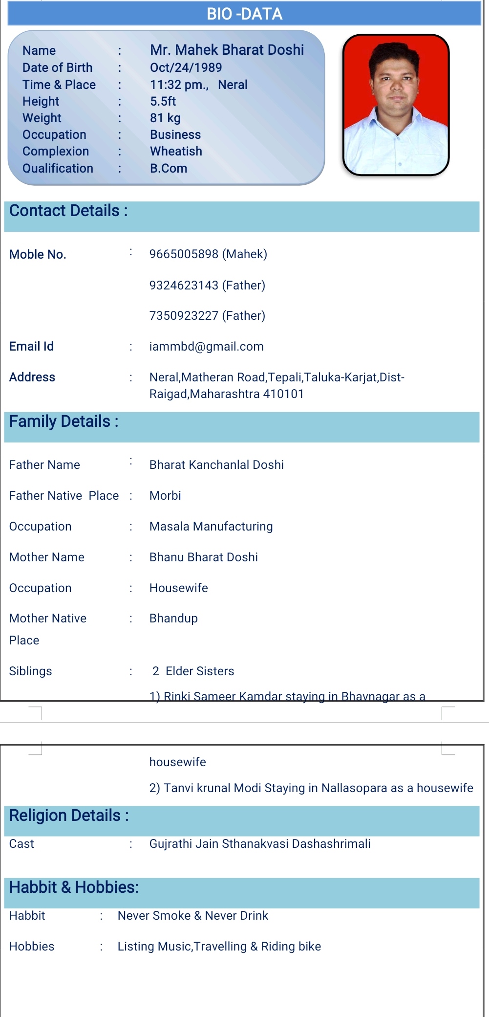 • Complete profile detail